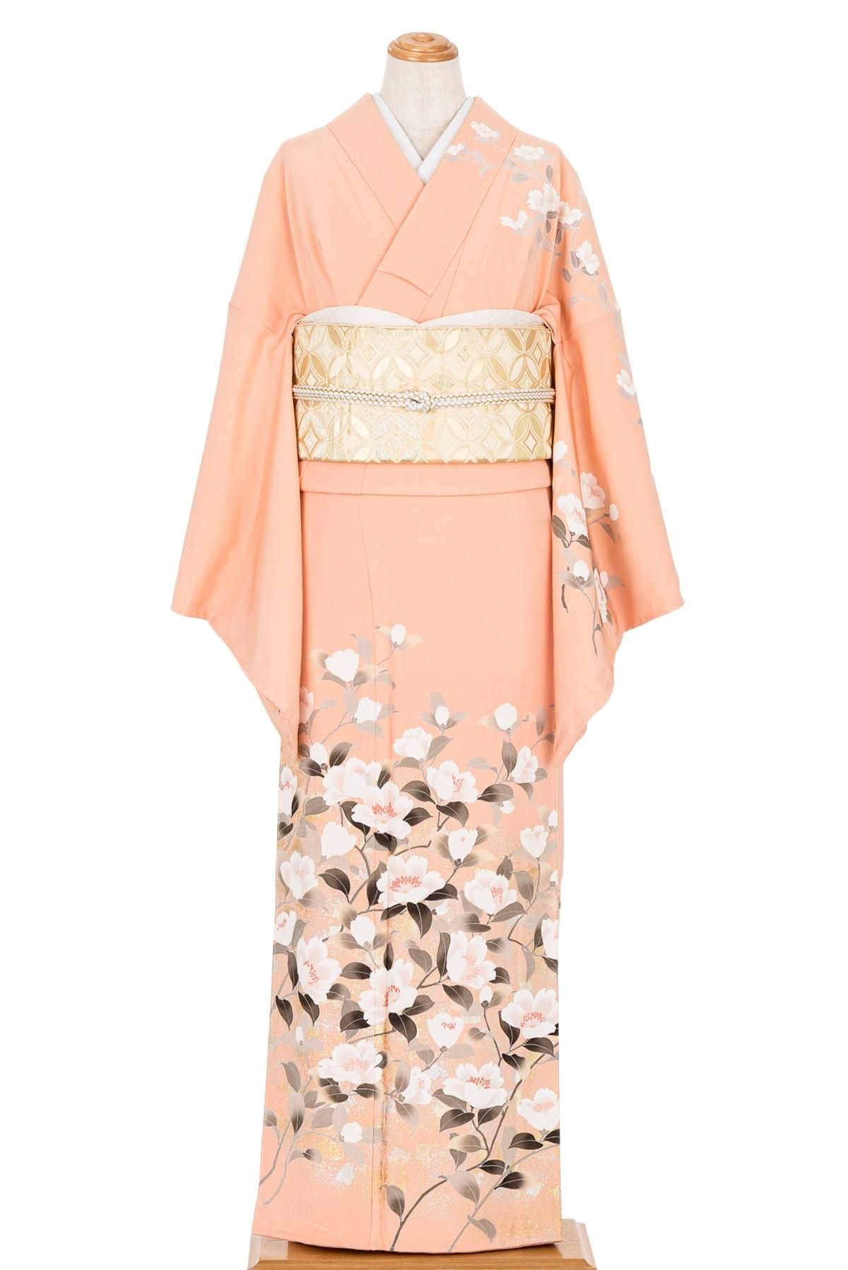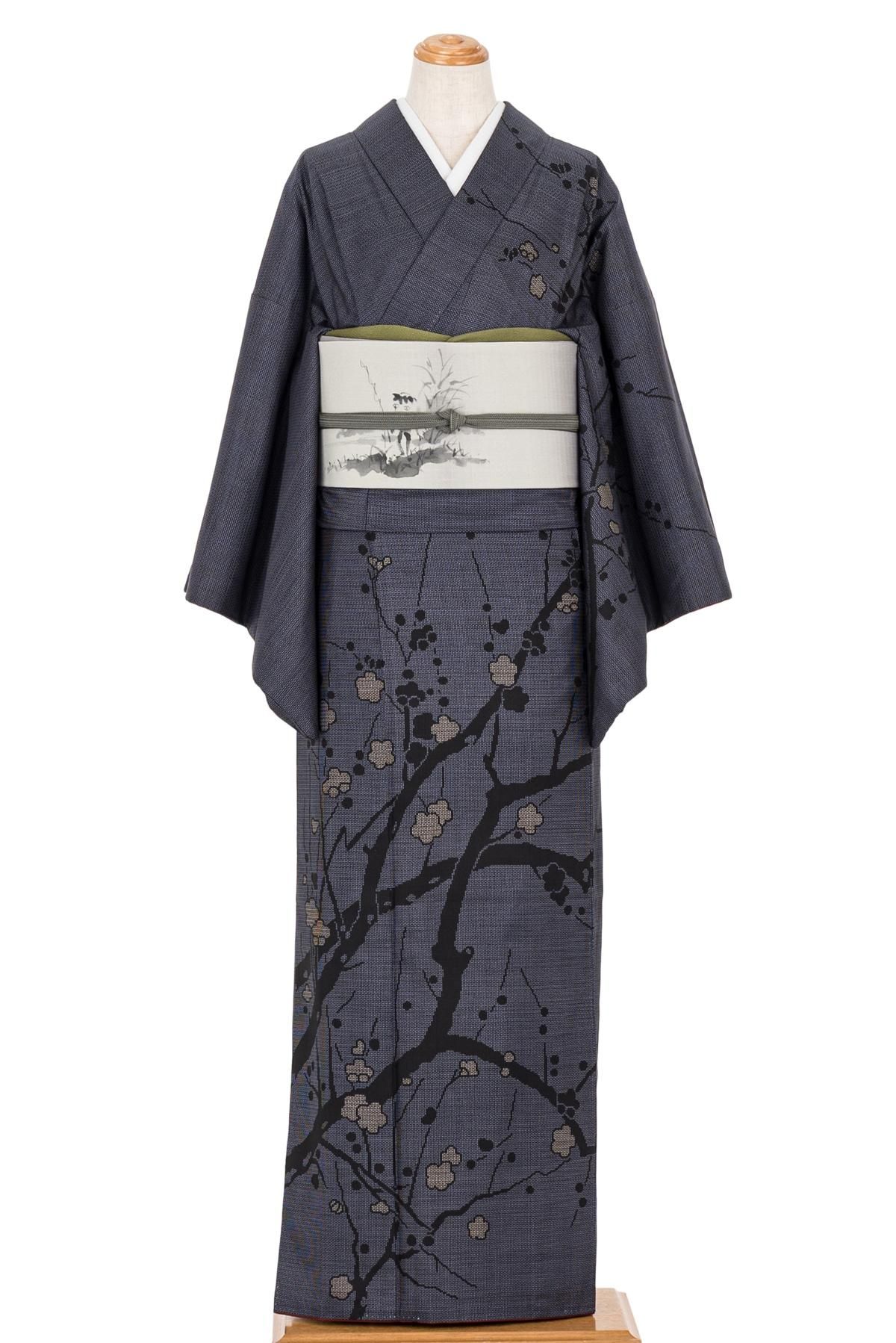 亀甲に重ね枝梅模様を織り出した大島紬の訪問着です。